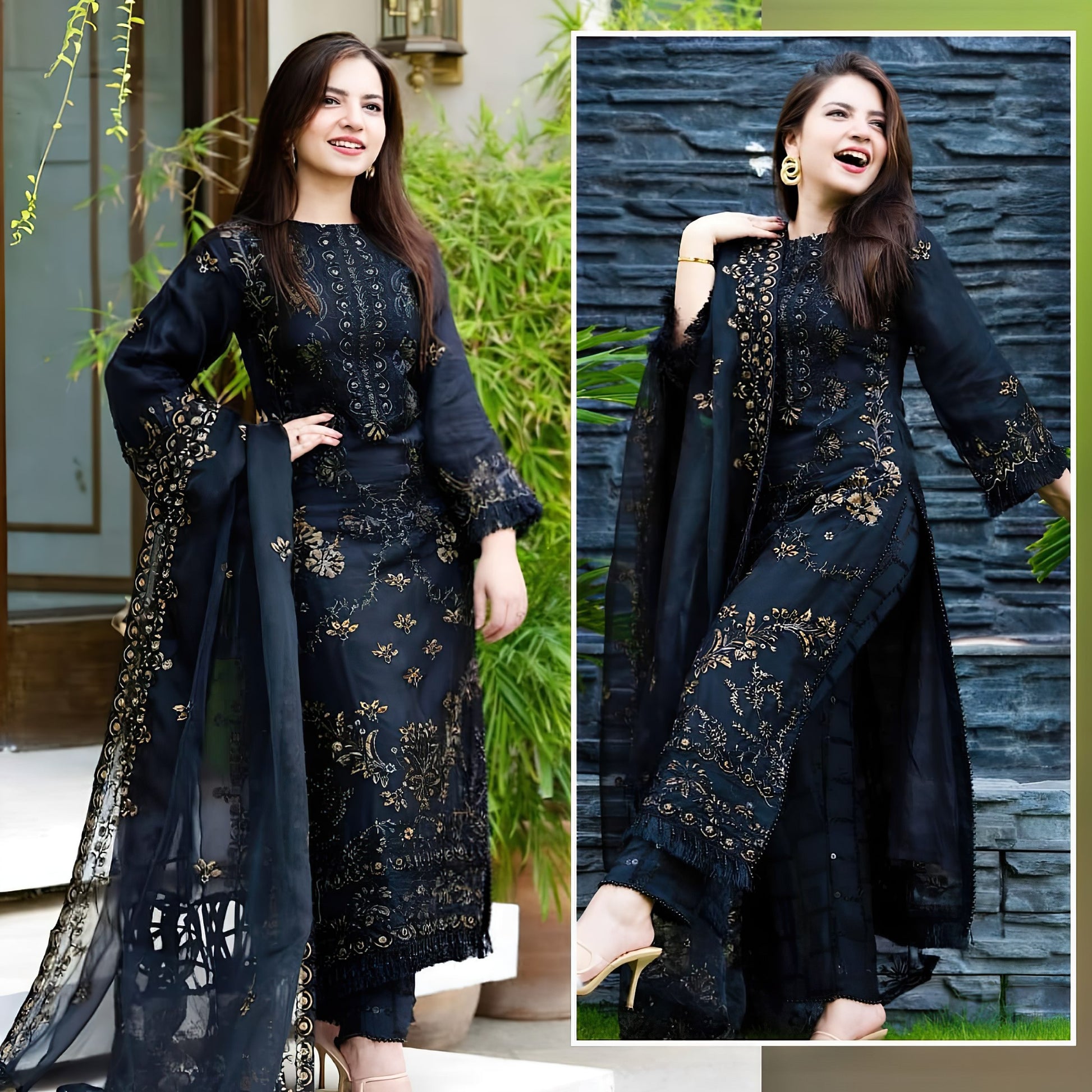 Is khoobsurat heavy embroidered dress ke sath apni elegance ko next level par le jaayein. Premium quality chiffon fabric par fine aur detailed embroidery ki gayi hai jo is outfit ko shaadi, party aur formal occasions ke liye perfect banati hai. Is ke sath chiffon embroidered dupatta diya gaya hai jo overall look ko aur bhi graceful aur royal touch deta hai. Soft fabric, luxury finishing aur stylish design is dress ko ek complete must-have banate hain.